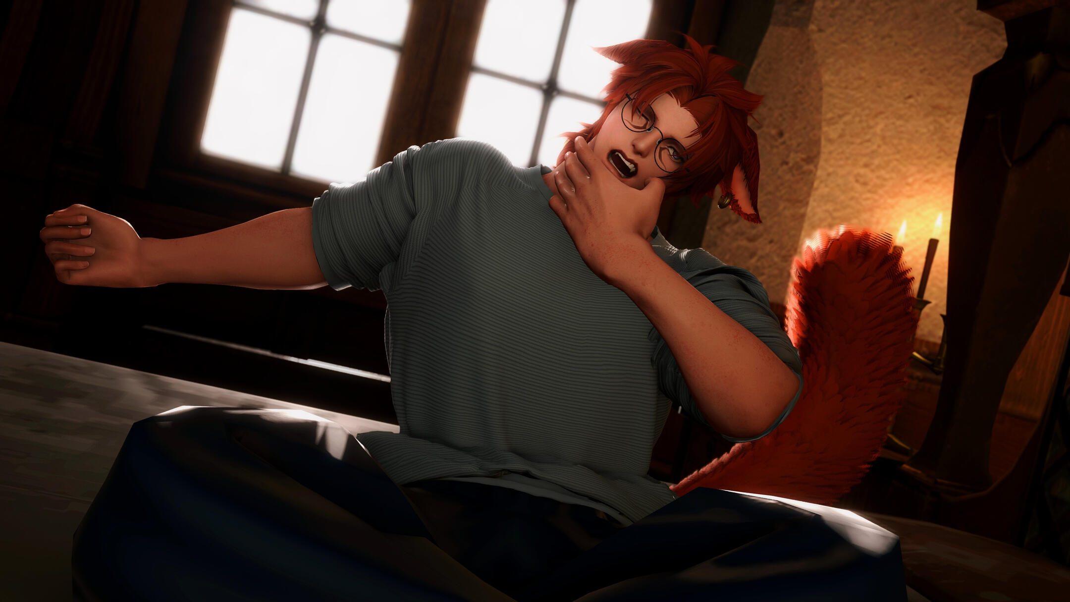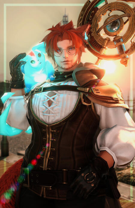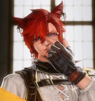Yuhvi’to is a fairly short Miqo’te, standing at 1.54 meters tall (5.0ft) with pale complexion and a slightly tubby body, a testament to his rather idle lifestyle and sugary indulgences. His hair is of deep crimson with orange highlights, wavy, reaching down to his nape and covering parts of his face, occasionally held back with a short ponytail. His eyes are vibrant blue, often seen behind a pair of large, circular brass glasses as years of reading and studying have compromised him of his once stellar vision.A pair of large, fluffy ears can be spotted on top of his head, two tufts of long fur standing out their very tips akin to the ears of a lynx. Their underbellies sport decorative piercings: two brass ear cuffs on his right ear and one more elaborate earring on his left, often adorned with a small piece of hanging quartz. His nails can grow quite long and sharp, and he very often has to clip and smooth them, while another racial characteristic is a pair of sharp canine fangs that can be clearly seen whenever he speaks.